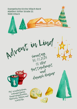 | 30.11 | 10 Uhr | 1. Adventsonntag mit Konfi-Vorstellung und musikalischer Begleitung des Heart-Chors Villach. Anschließend Weihnachtsbasar und Advent in Lind |
